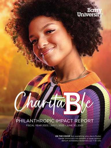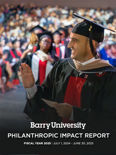 The Barry University Philanthropic Impact report is published annually by the Office of Institutional Advancement to share stories of its most inspiring and generous donors, their motivations for giving, and the difference they are making in the lives of so many.